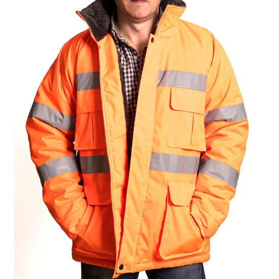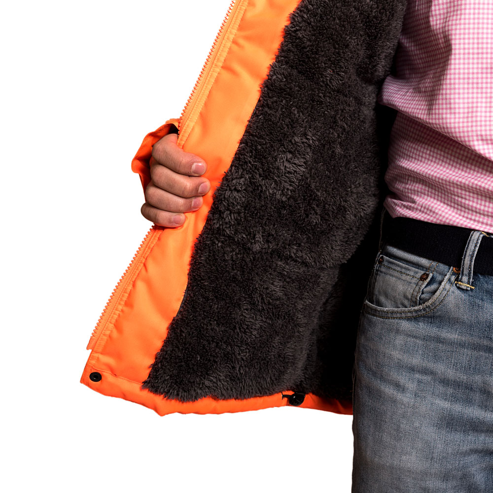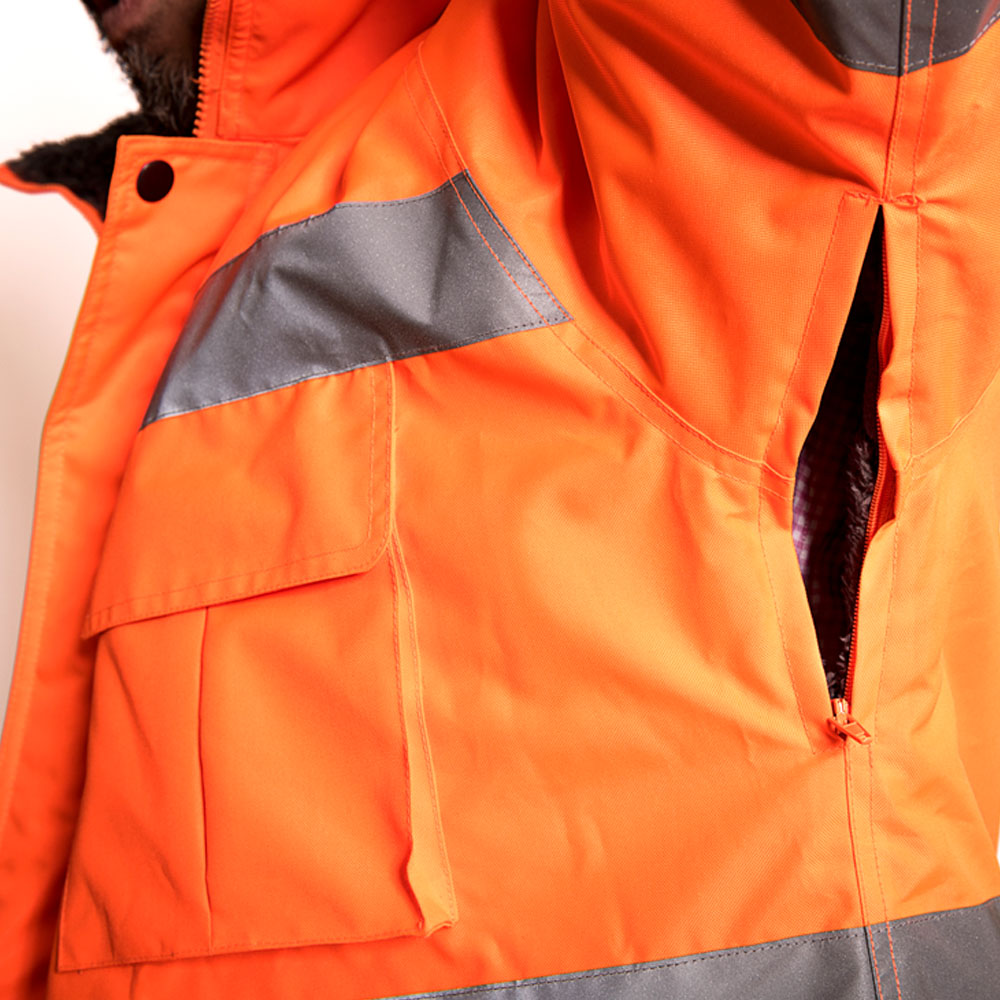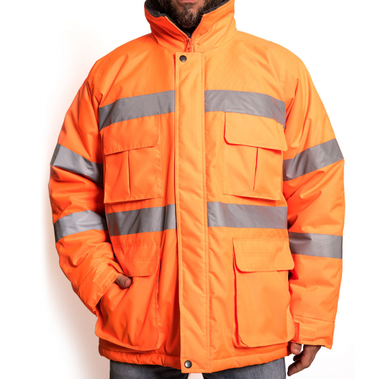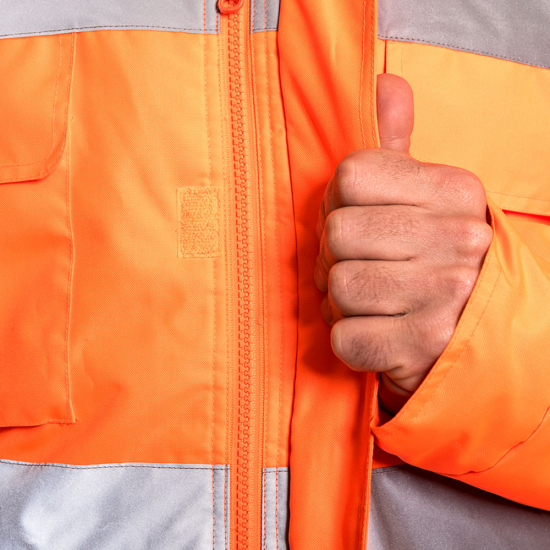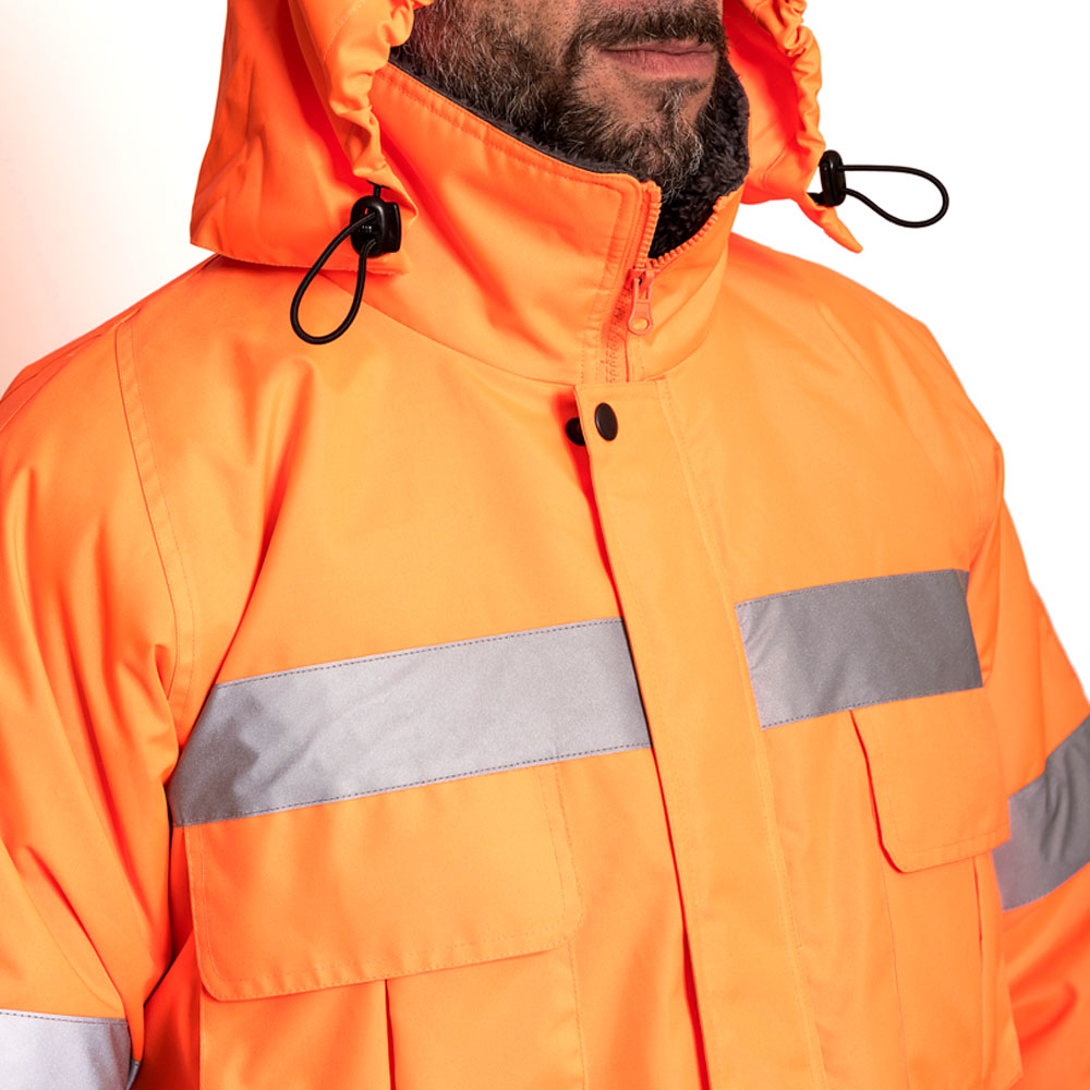 Fabricado en Oxford 300 D, material de alta duración formulado para mayor resistencia al desgaste causado por el uso. Producto diseñado con un aislante térmico que se adapta a bajas temperaturas y Humedad por su impermeabilidad media, ventilación bajo el brazo con cierre, Forro de corderito polar y abrigo en Guata de 140 Grs. Cuenta con dos líneas de cinta reflectante de 5 cm. en pecho y espalda. Gorro con cordón de ajuste, el cual se guarda bajo el cuello de la prenda. Provisto de 4 bolsillos tipo cargo y 2 tipo canguros delanteros de fácil acceso para mayor funcionalidad de la prenda.