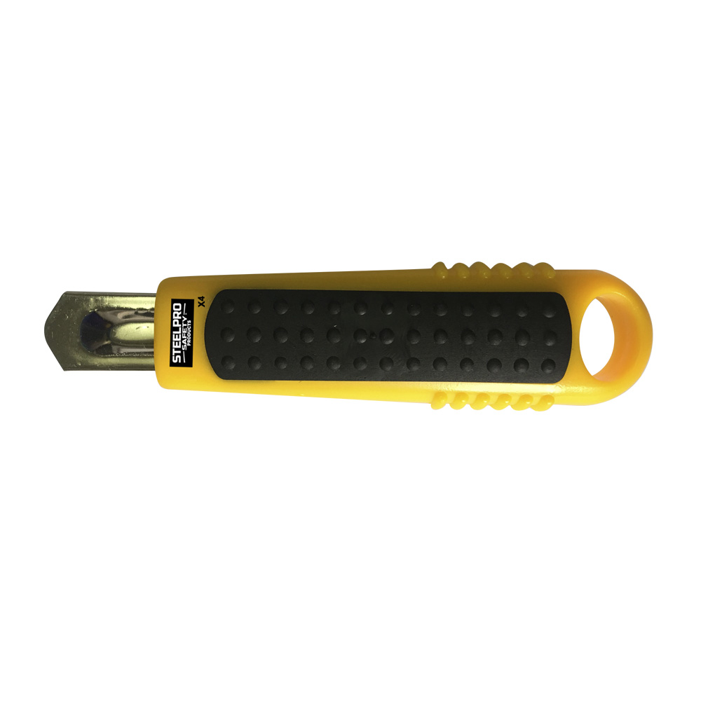 El cuchillo cartonero STEELPRO X-4 es un instrumento de precisión profesional. Posee un mecanismo de seguridad retráctil que recoge la hoja de manera automática, el mismo sistema obliga al operador a mantener el control de la hoja expuesta, reduciendo el riesgo de accidente al momento de reposo de la herramienta.