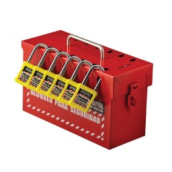 Caja de bloqueo para lock out color roja, medidas 15,4 cm alto X 26 cm largo x 11 cm de ancho.