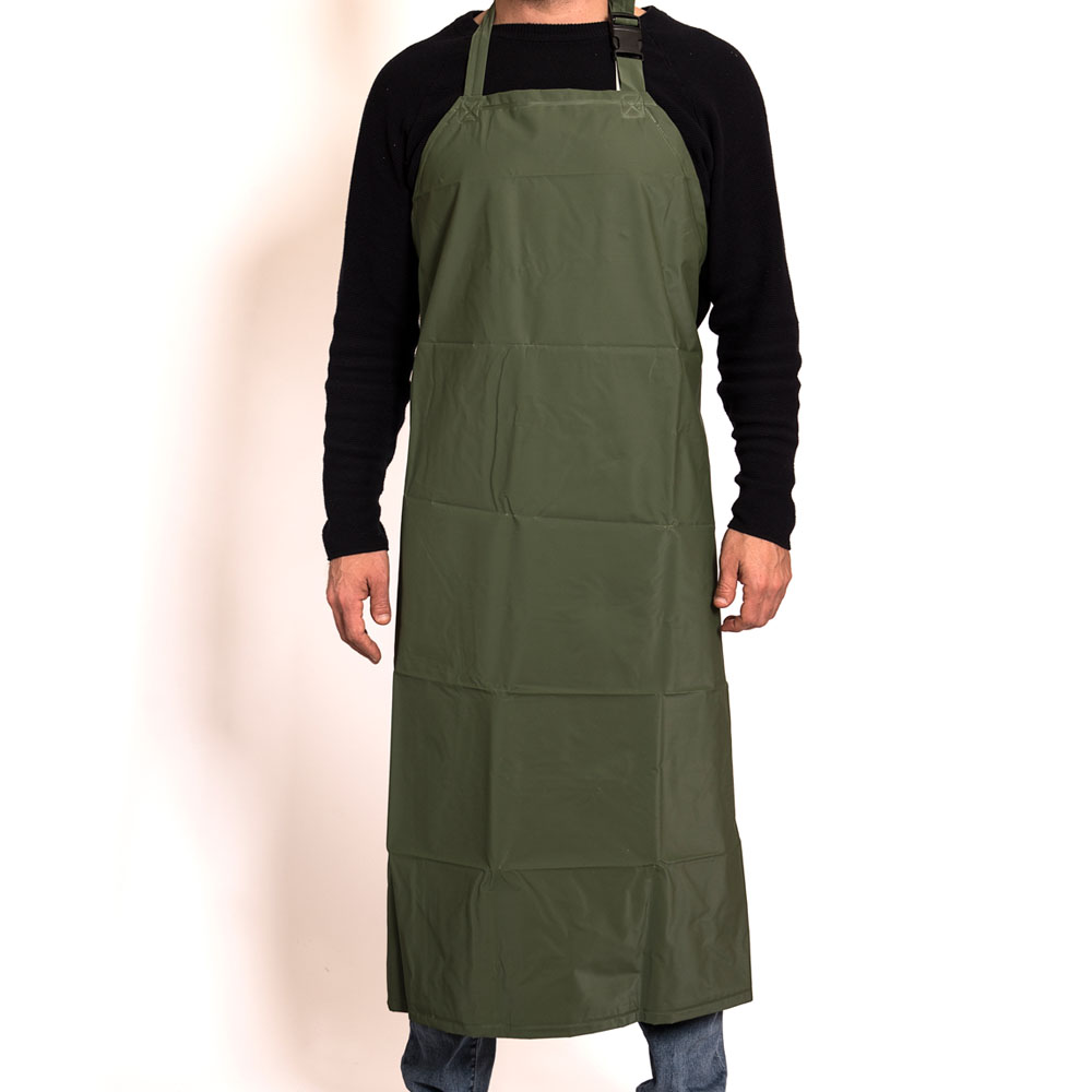 Delantal PVC con refuerzo abdominal del mismo material, tamaño 0,90 x 1,20 Mts., Durable incluso en los ambientes donde la abrasión representa un problema. PVC/Poliéster/PVC 0,60 micrones por película laminada, ojales de PVC transparente soldados electrónicamente, lo que ofrece un diferencial alto, dado que no generan presencia de óxido, Broche de cierre plástico y cinta de ajuste de cintura en poliéster.