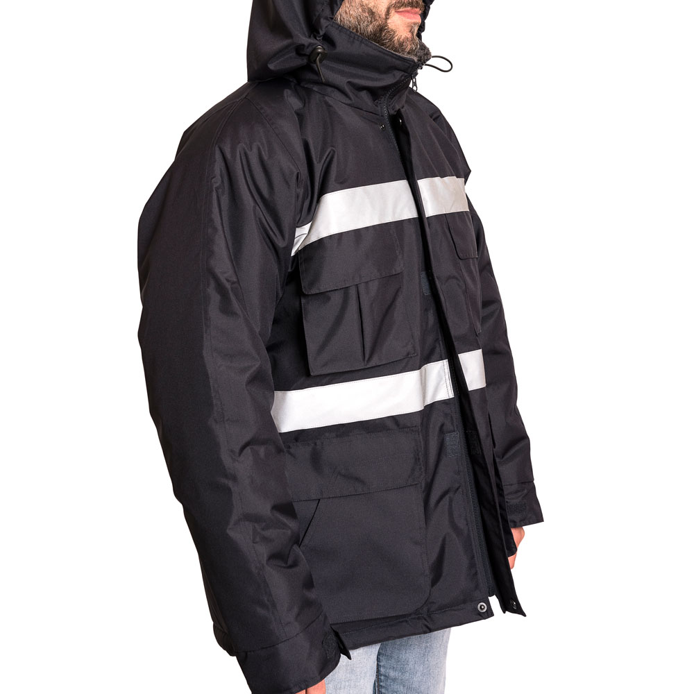 Fabricado en Oxford 300 D, material de alta duración formulado para mayor resistencia al desgaste causado por el uso. Producto diseñado con un aislante térmico que se adapta a bajas temperaturas y Humedad por su impermeabilidad media, ventilación bajo el brazo con cierre, Forro de corderito polar y abrigo en Guata de 140 Grs. Cuenta con dos líneas de cinta reflectante de 5 cm. en pecho y espalda. Gorro con cordón de ajuste, el cual se guarda bajo el cuello de la prenda. Provisto de 4 bolsillos tipo cargo y 2 tipo canguros delanteros de fácil acceso para mayor funcionalidad de la prenda.