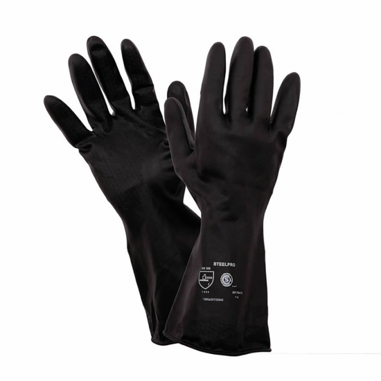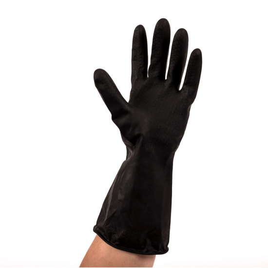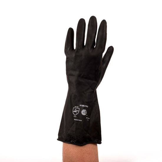 Fabricado en una película de látex interior liso naranja y ex-terior negro con un diseño especial de ingeniería en palma y dedos que le entregan un excelente grip; puño enrollado para mayor resistencia al enguante, amplia protección a áci-dos, solventes y químicos en general, excelente resistencia en su segmento a la abrasión.