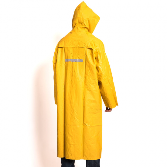 Conjunto de dos piezas (chaqueta con gorro incorporado), Tela anti desgarro de alta resistencia, 100% impermeable, broches a presión, Esclavina para ventilación en espalda. Costuras selladas electrónicamente por alta frecuencia, cinta reflectiva en espalda