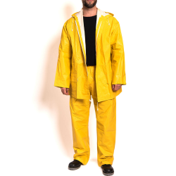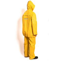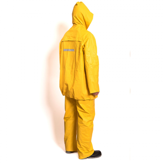 Conjunto de dos piezas (chaqueta con gorro incorporado y jardinera), Tela anti desgarro de alta resistencia, 100% impermeable, broches a presión, Esclavina para ventilación en espalda. Costuras selladas electrónicamente por alta frecuencia, suspensor elástico con hebilla de ajuste, cinta reflectiva en espalda