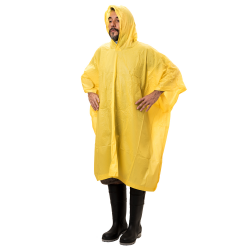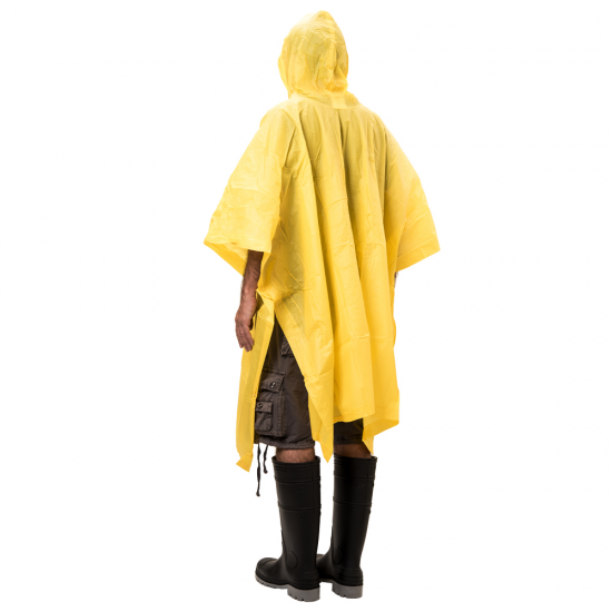 Poncho en una pieza con capucha incluida. 100 % PVC impemeable, doble broche de presión por cada lateral, 0,10 mm de espesor, costuras termoselladas.
